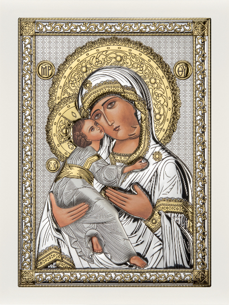 Produs în stil autentic bizantin, această icoană reprezintă o copie a originalului. Este fabricată în Italia, în ateliere cu tradiţie în iconografie. Icoana este produsă dintr-o parte metalică placată cu argint de puritate 999.9 acoperită cu un lac protector pentru a nu se deteriora în timp, suprapusă pe un suport de lemn. Mărimea : (10x12cm)