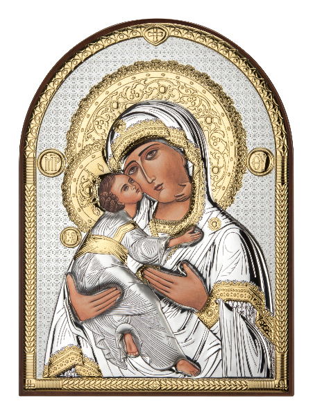 Produs în stil autentic bizantin, această icoană reprezintă o copie a originalului. Este fabricată în Italia, în ateliere cu tradiţie în iconografie. Icoana este produsă dintr-o parte metalică placată cu argint de puritate 999.9 acoperită cu un lac protector pentru a nu se deteriora în timp, suprapusă pe un suport de lemn. Mărimea : (13x16,5cm)
