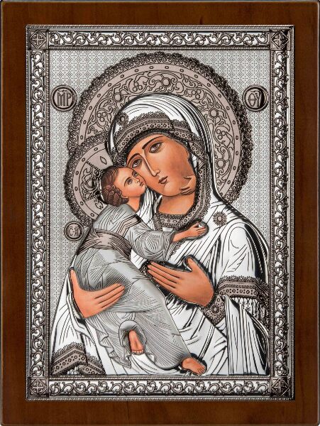 Produs în stil autentic bizantin, această icoană reprezintă o copie a originalului. Este fabricată în Italia, în ateliere cu tradiţie în iconografie. Icoana este produsă dintr-o parte metalică placată cu argint de puritate 999.9 acoperită cu un lac protector pentru a nu se deteriora în timp, suprapusă pe un suport de lemn. Mărimea : (13x16,5cm)