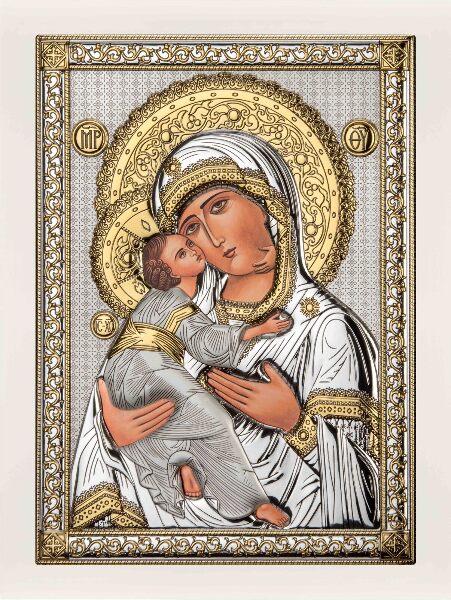 Produs în stil autentic bizantin, această icoană reprezintă o copie a originalului. Este fabricată în Italia, în ateliere cu tradiţie în iconografie. Icoana este produsă dintr-o parte metalică placată cu argint de puritate 999.9 acoperită cu un lac protector pentru a nu se deteriora în timp, suprapusă pe un suport de lemn. Mărimea : (13x16,5cm)
