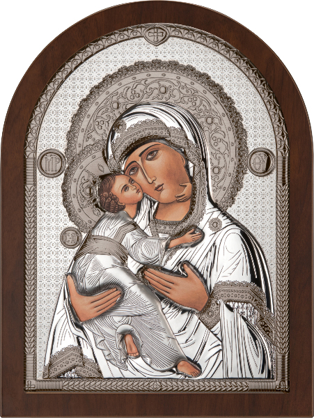 Produs în stil autentic bizantin, această icoană reprezintă o copie a originalului. Este fabricată în Italia, în ateliere cu tradiţie în iconografie. Icoana este produsă dintr-o parte metalică placată cu argint de puritate 999.9 acoperită cu un lac protector pentru a nu se deteriora în timp, suprapusă pe un suport de lemn. Mărimea 3 (13x16.5cm)