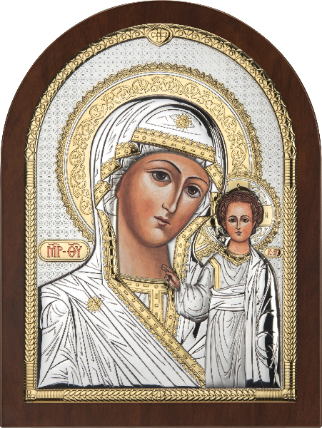 Produs în stil autentic bizantin, această icoană reprezintă o copie a originalului. Este fabricată în Italia, în ateliere cu tradiţie în iconografie. Icoana este produsă dintr-o parte metalică placată cu argint de puritate 999.9 acoperită cu un lac protector pentru a nu se deteriora în timp, suprapusă pe un suport de lemn. Mărimea : (16,5x21,5cm)