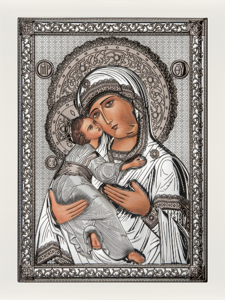 Produs în stil autentic bizantin, această icoană reprezintă o copie a originalului. Este fabricată în Italia, în ateliere cu tradiţie în iconografie. Icoana este produsă dintr-o parte metalică placată cu argint de puritate 999.9 acoperită cu un lac protector pentru a nu se deteriora în timp, suprapusă pe un suport de lemn. Mărimea : (26,5x36,5cm)