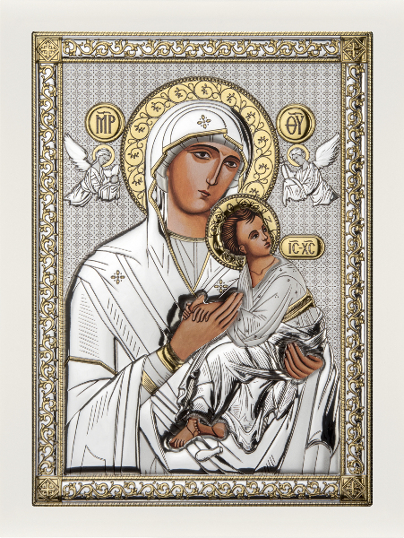 Produs în stil autentic bizantin, această icoană reprezintă o copie a originalului. Este fabricată în Italia, în ateliere cu tradiţie în iconografie. Icoana este produsă dintr-o parte metalică placată cu argint de puritate 999.9 acoperită cu un lac protector pentru a nu se deteriora în timp, suprapusă pe un suport de lemn. Mărimea : (16,5x21,5cm)