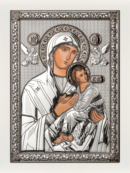 Produs în stil autentic bizantin, această icoană reprezintă o copie a originalului. Este fabricată în Italia, în ateliere cu tradiţie în iconografie. Icoana este produsă dintr-o parte metalică placată cu argint de puritate 999.9 acoperită cu un lac protector pentru a nu se deteriora în timp, suprapusă pe un suport de lemn. Mărimea : (16,5x21,5cm)