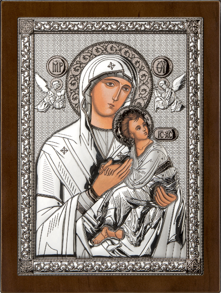 Produs în stil autentic bizantin, această icoană reprezintă o copie a originalului. Este fabricată în Italia, în ateliere cu tradiţie în iconografie. Icoana este produsă dintr-o parte metalică placată cu argint de puritate 999.9 acoperită cu un lac protector pentru a nu se deteriora în timp, suprapusă pe un suport de lemn. Mărimea : (26,5x36,5cm)