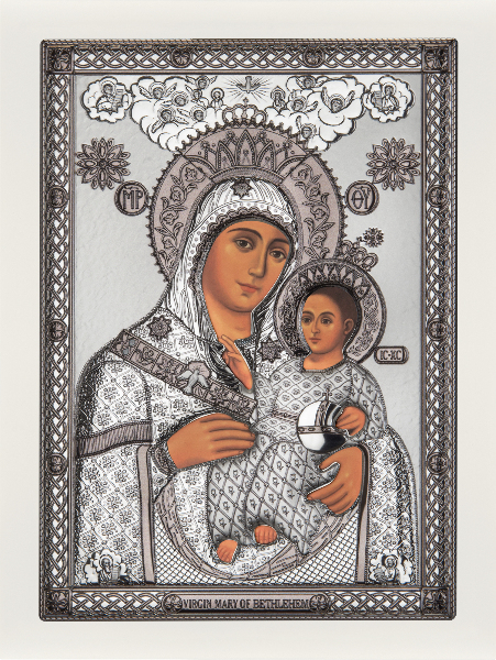 Produs în stil autentic bizantin, această icoană reprezintă o copie a originalului. Este fabricată în Italia, în ateliere cu tradiţie în iconografie. Icoana este produsă dintr-o parte metalică placată cu argint de puritate 999.9 acoperită cu un lac protector pentru a nu se deteriora în timp, suprapusă pe un suport de lemn. Mărimea : (21,5x28,5cm)